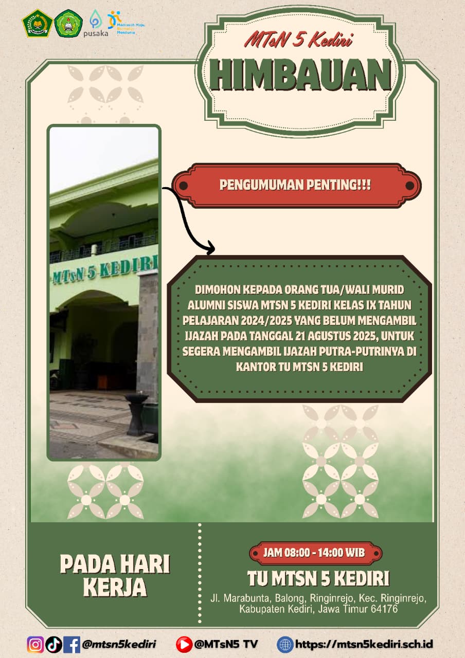 Berubah Nama Menjadi MTsN 5 Kediri Berdasarkan Keputusan Menteri Agama No. 675 Tahun 2016